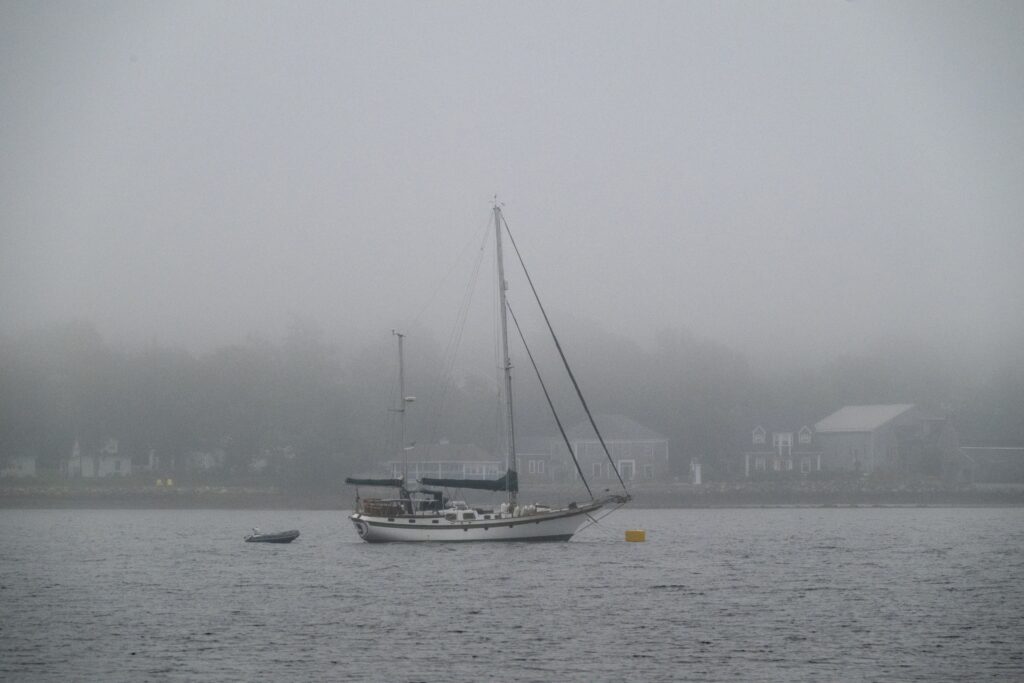 A sailboat moored in Shelburne Harbour on a very foggy day