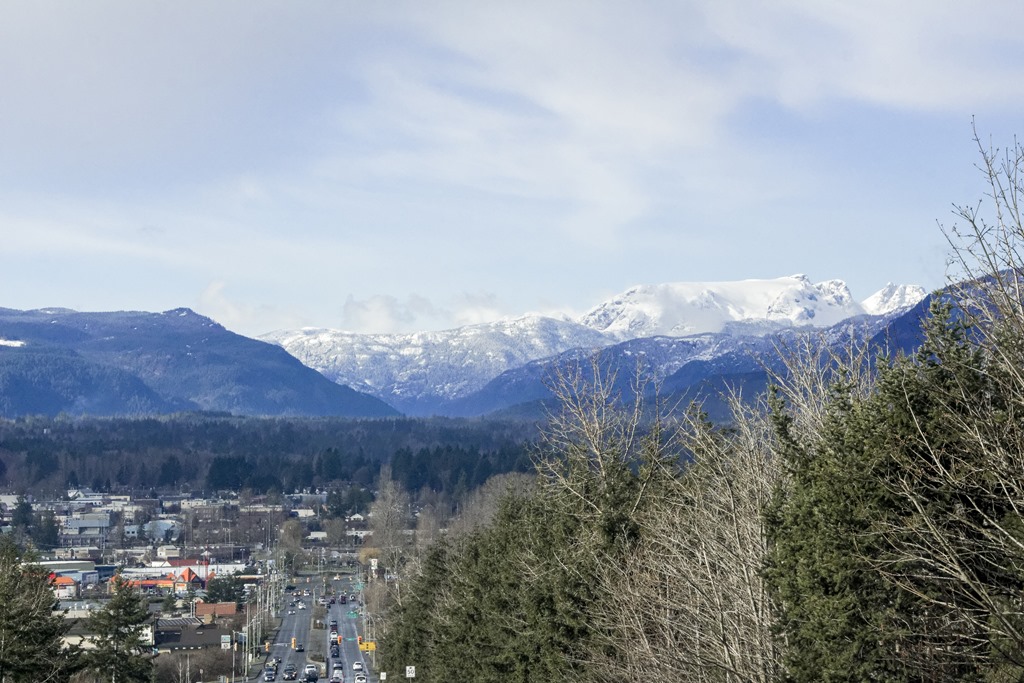 Looking down Ryan Road into Courtenay and toward the Comox Glacier