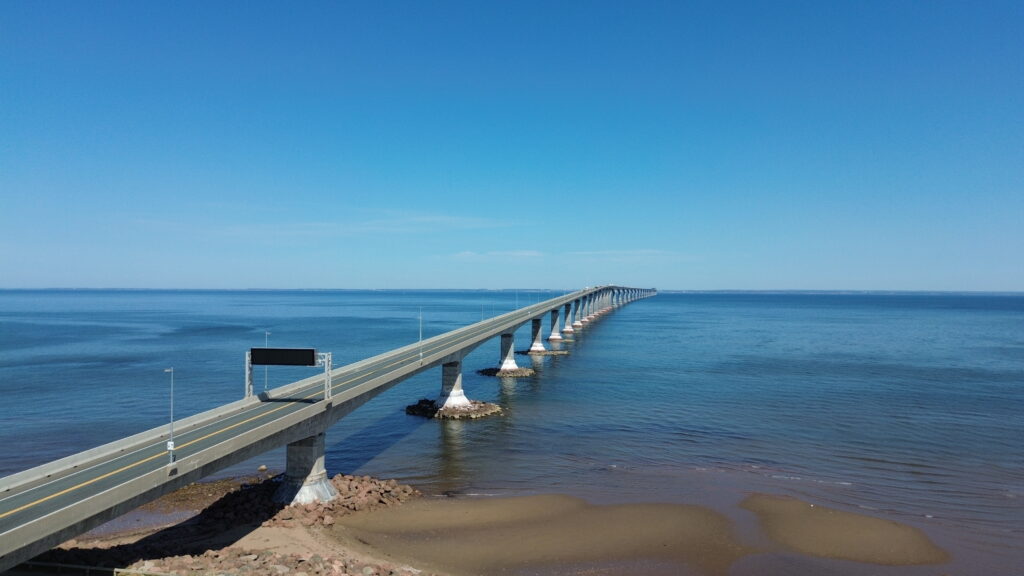 The Confederation Bridge running between PEI and New Brunswick, viewed from Cape Jourimain, on the shore of the Northumberland Strait at the southeastern extremity of New Brunswick.