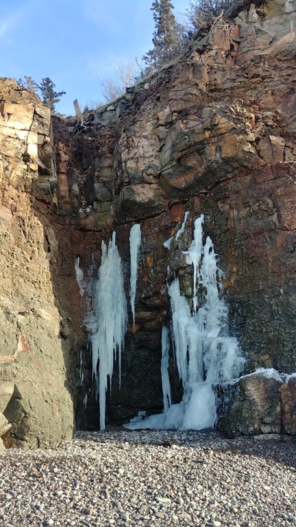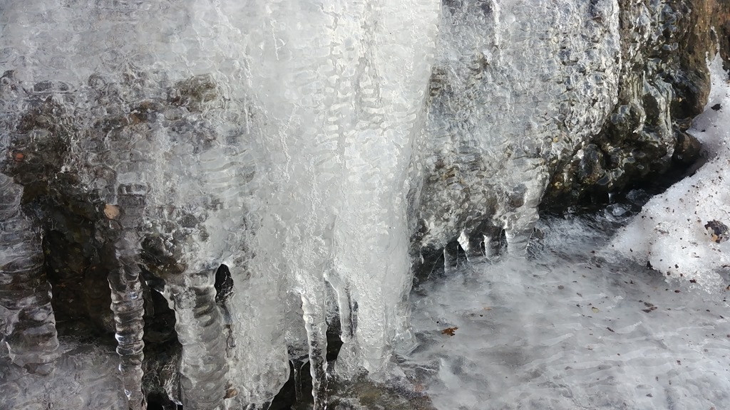 Dripping and flowing water, a nice sound, and rather interesting to watch – but also a warning that the ice formations may not be totally stable, and like the rocks above, could fall at any time.