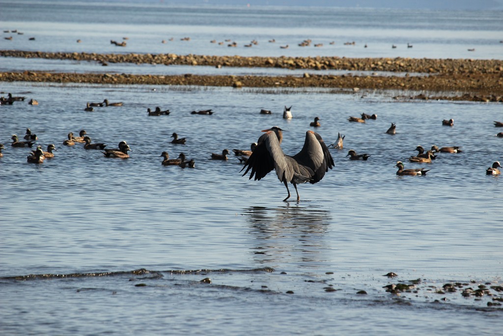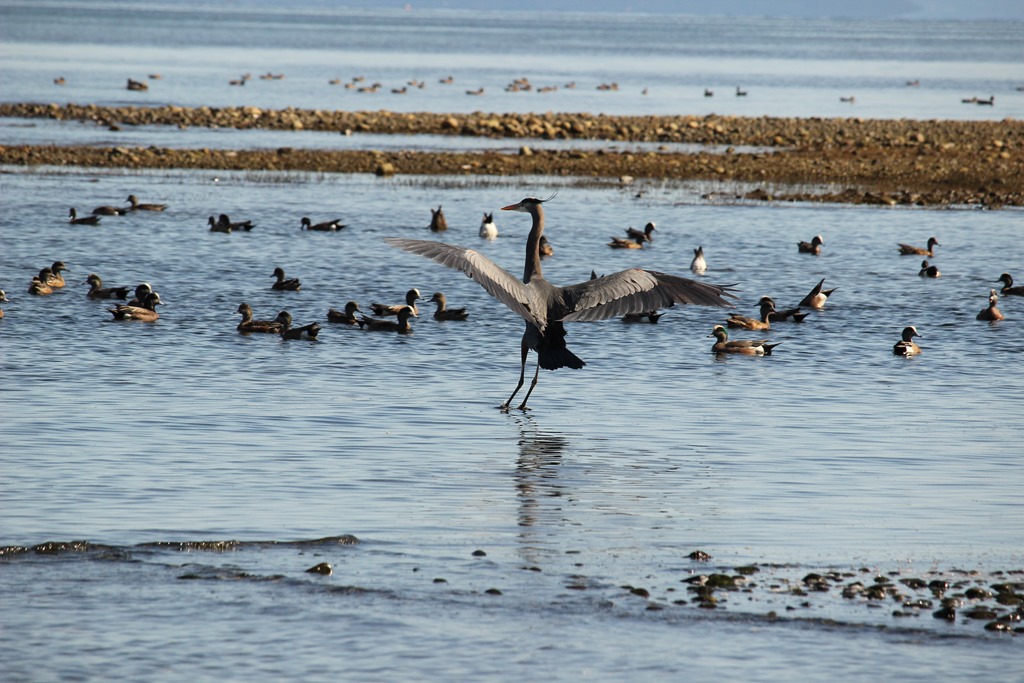 Herons are a fishing bird, preferring shallow intertidal zones, swamps, lake edges, and occasionally, backyard ponds. Herons hunt by wading slowly through shallow waters, remaining immobile until a fish swims close enough, and then striking quickly with their neck outstretched to pluck the fish out of the water.