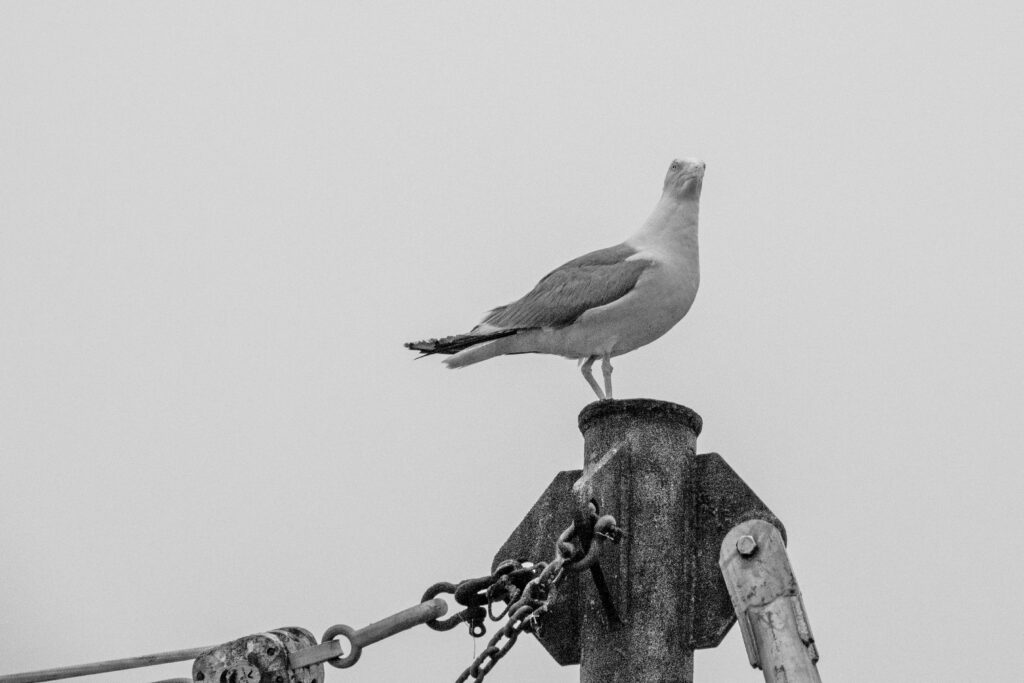 A serious looking seagull sitting on top of a stick on a fishing boat in Gunning Cove