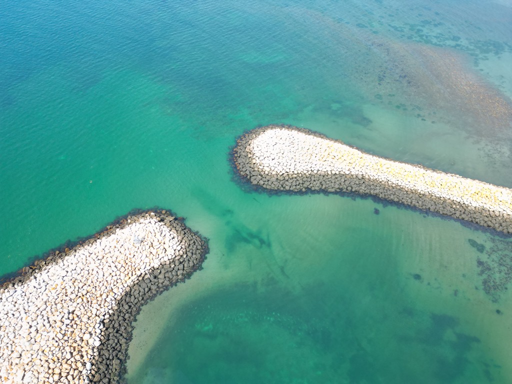 An aerial view of Saulnierville harbour and the breakwater entrance
